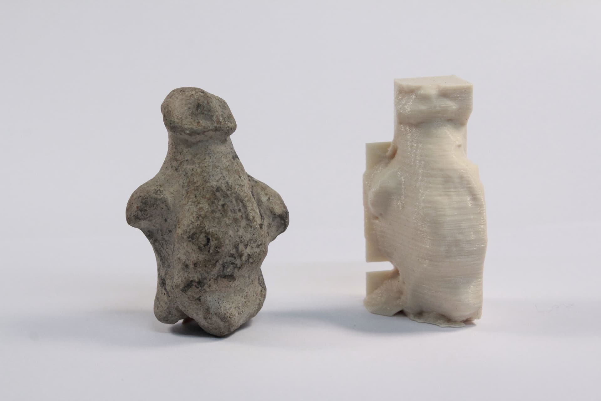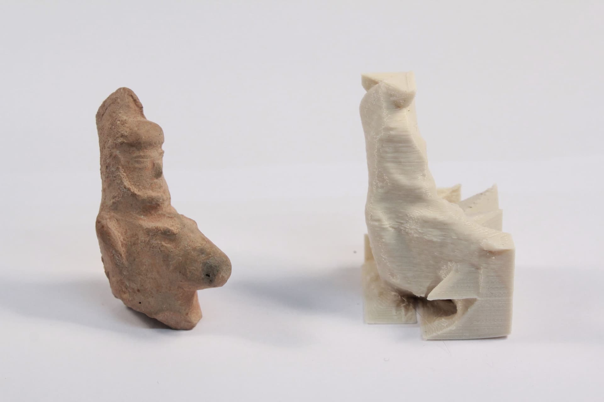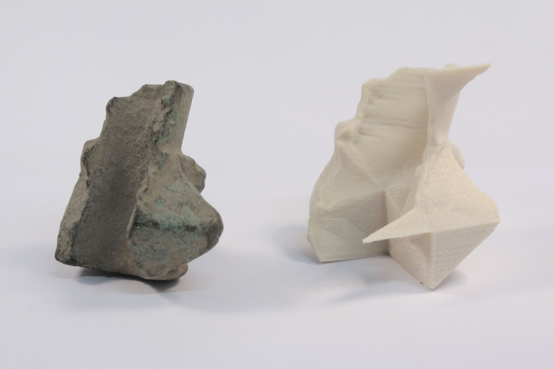 En détournant la technique de la photogrammetrie (permettant une recomposition fidèle en 3D d’un objet), l’artiste demande à l’ordinateur de réaliser un modèle à partir de trop peu d’images d’un artefact archéologique. Il doit alors interpréter par lui-même les zones qu’il ne connait pas, générant des formes qui n’existent pas dans la réalité.