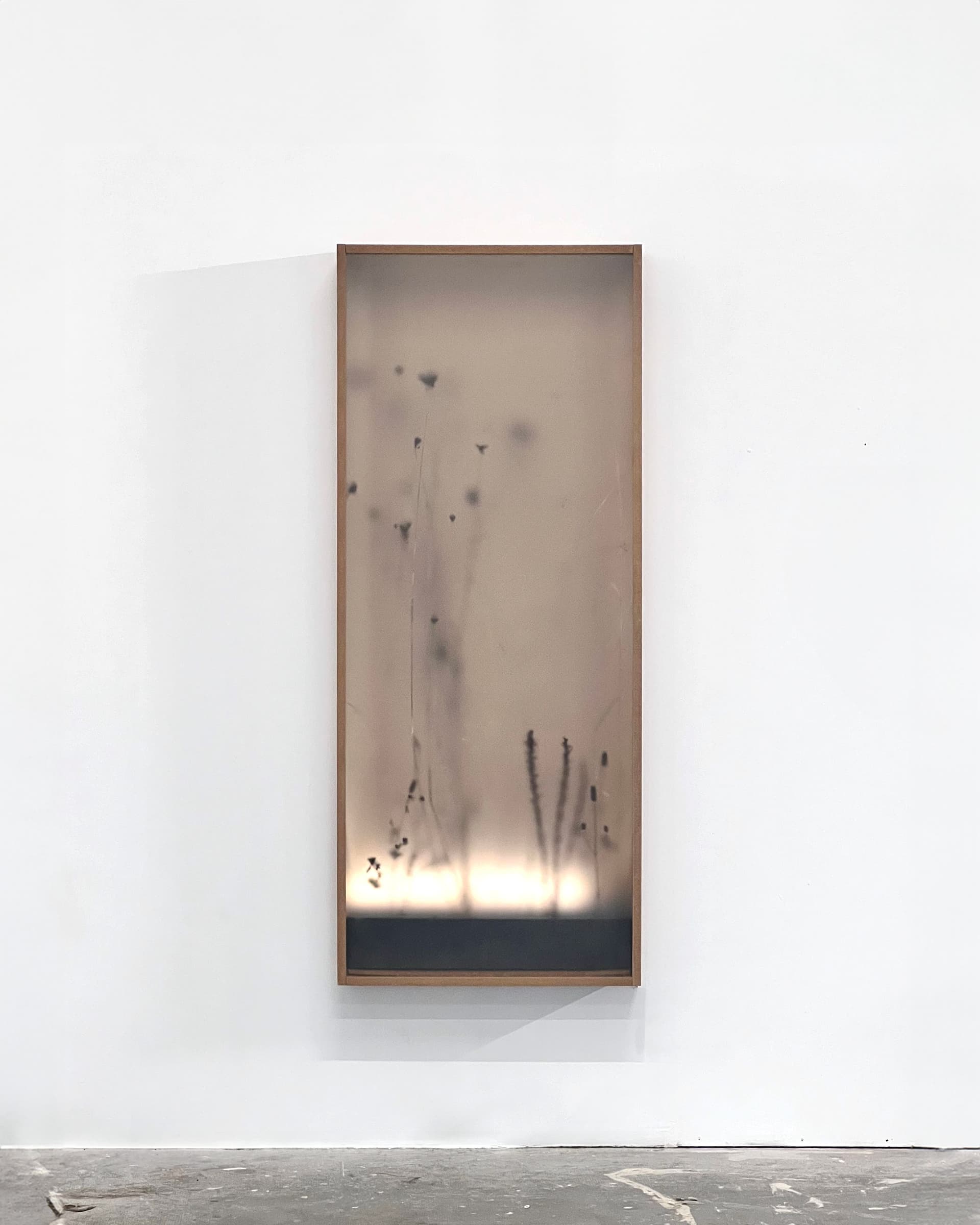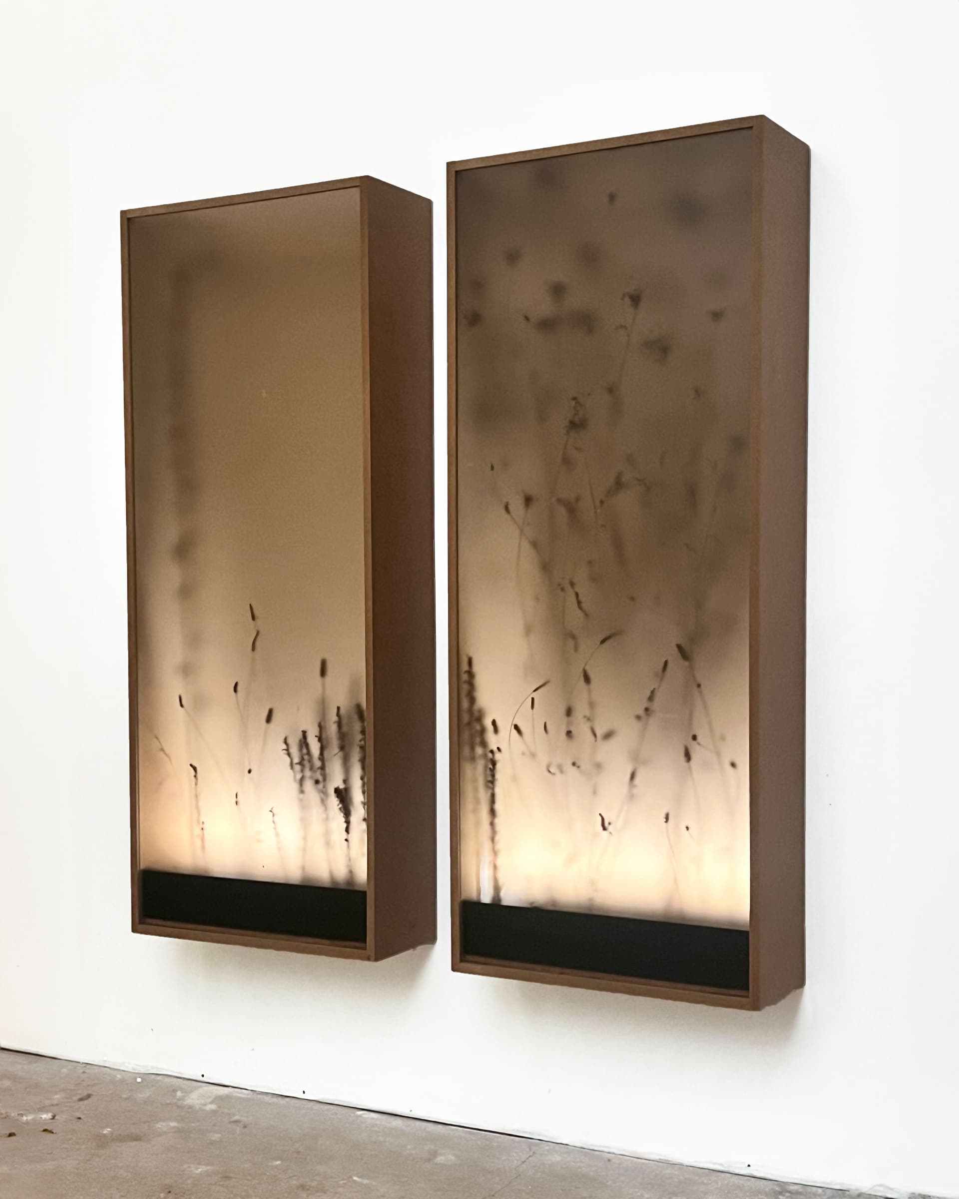 Ward, 2024 - Caissons lumineux. Bois, verre fumé, métal, plantes, lumière.