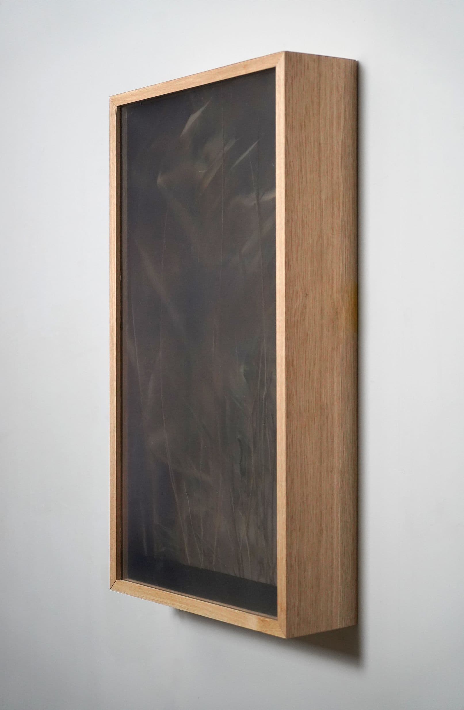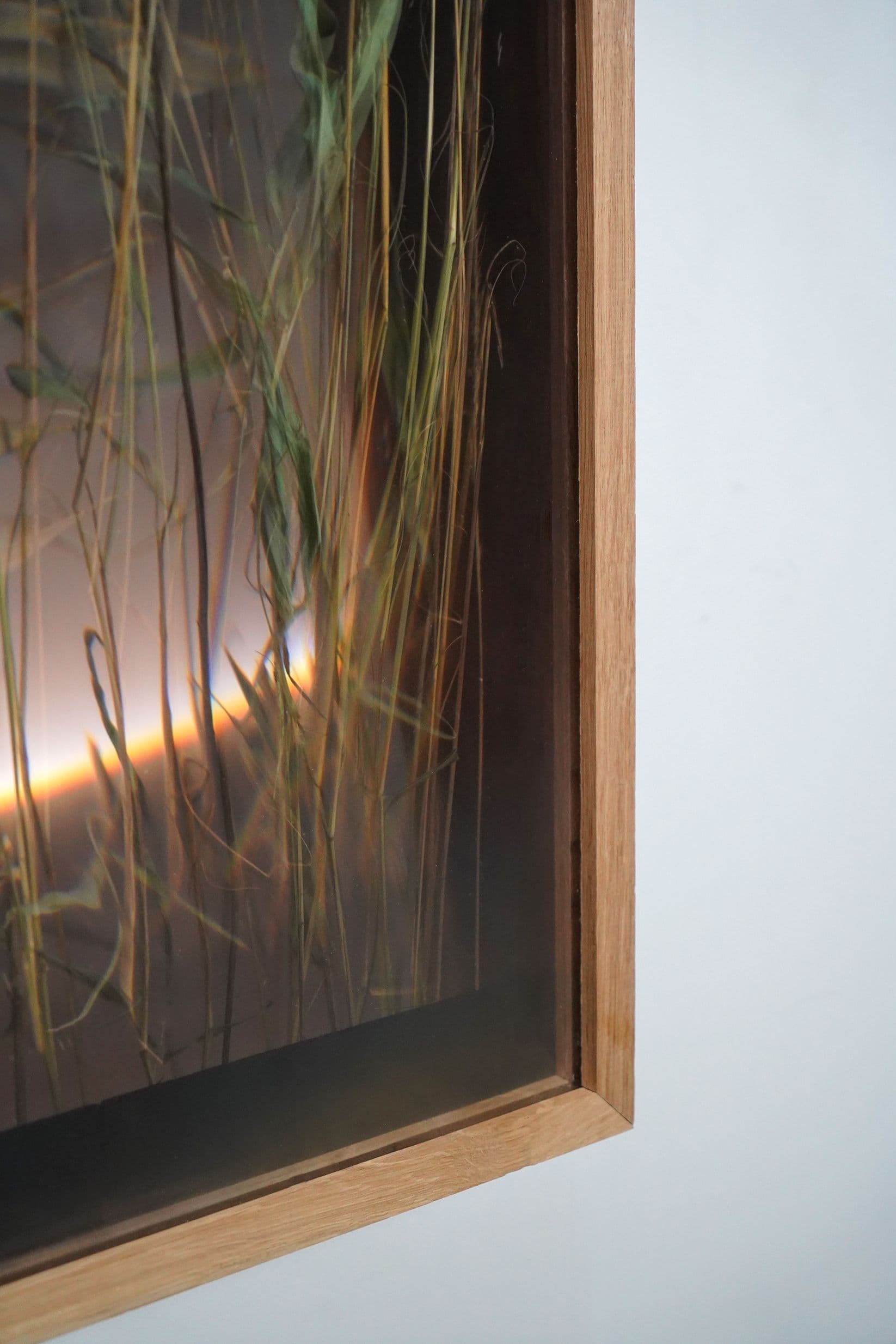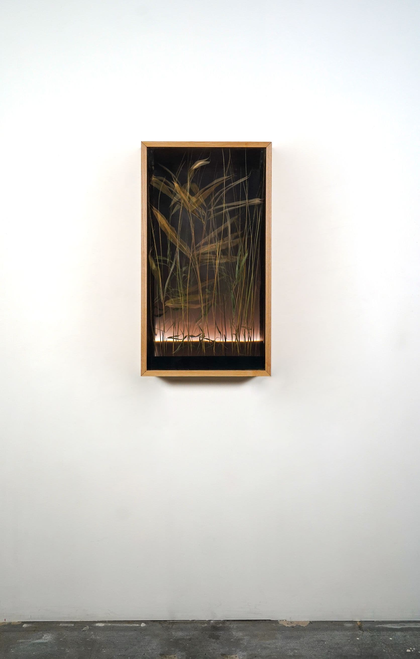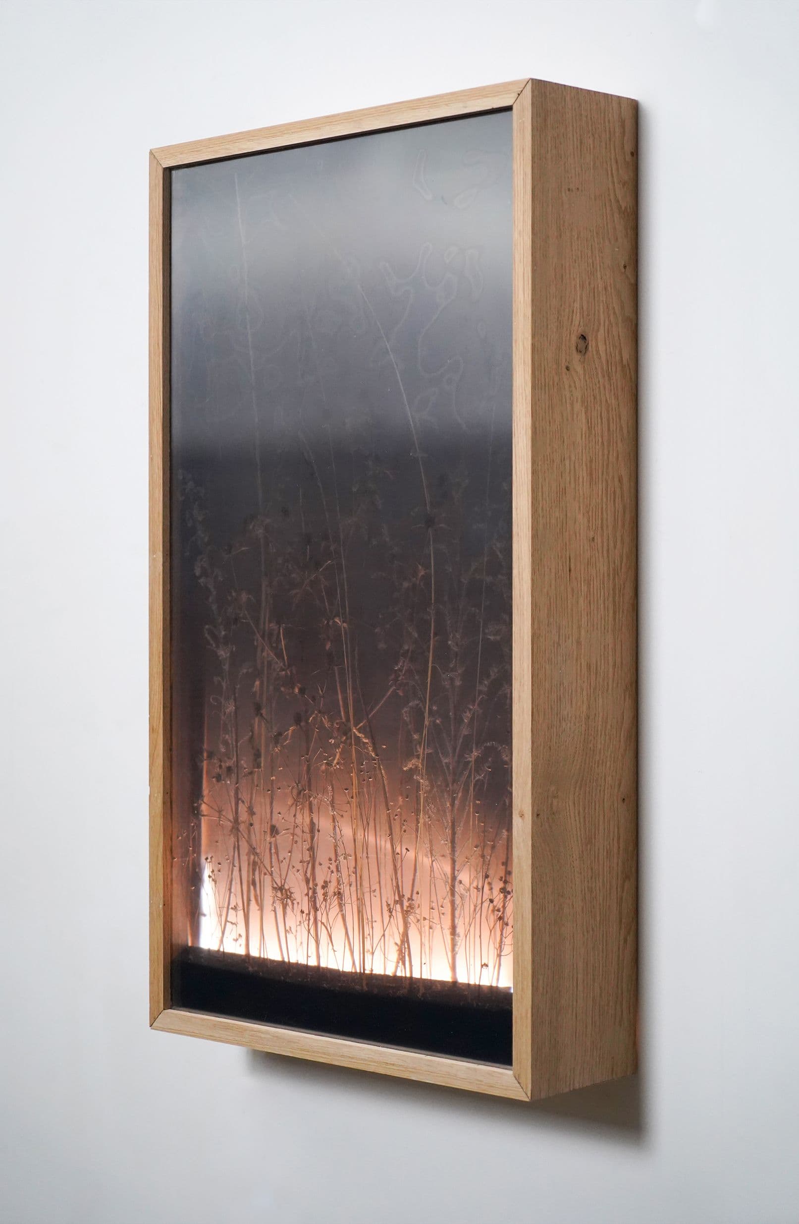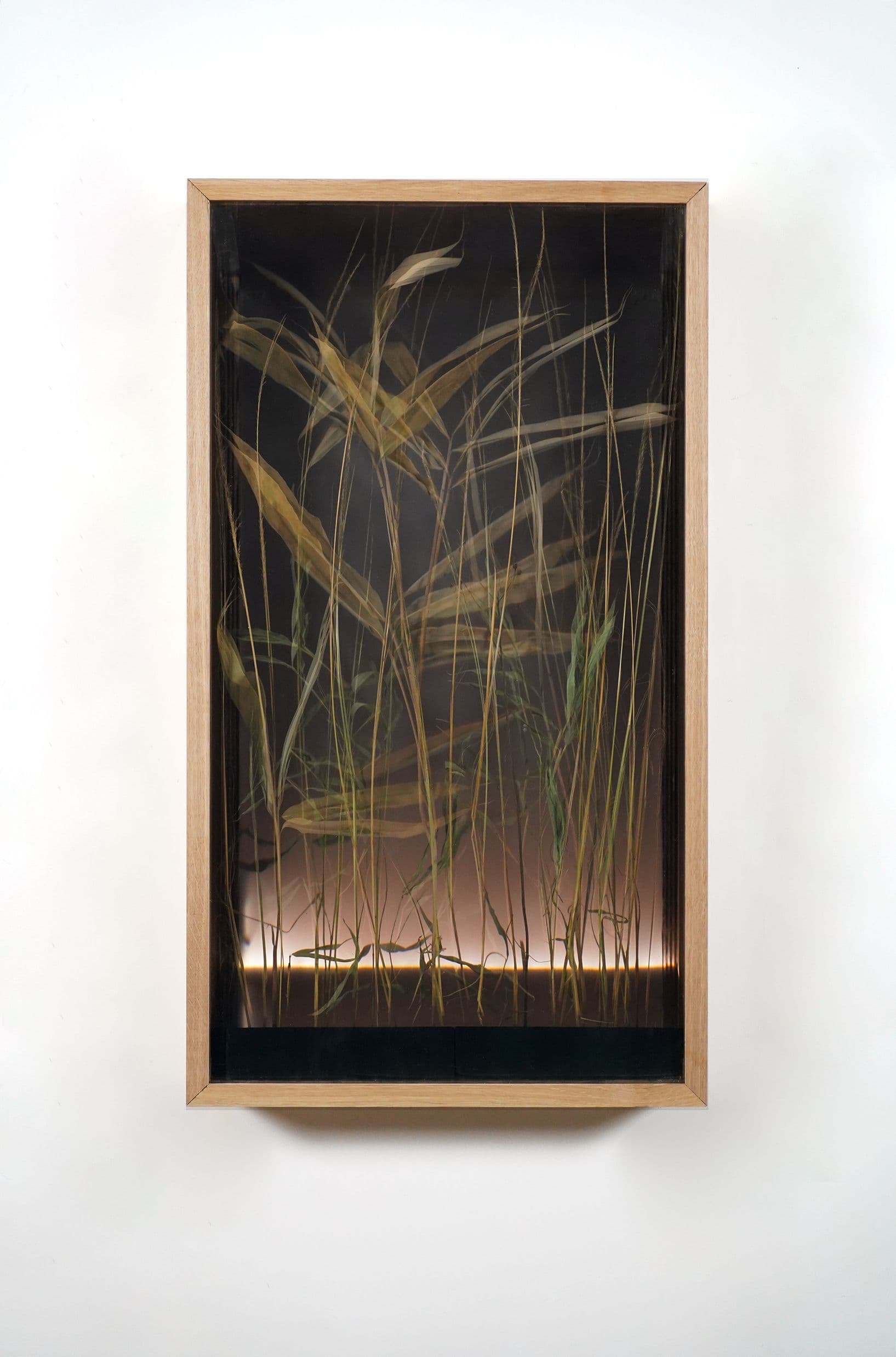 Ward 2025, 2025 - Caissons lumineux. Bois, verre fumé, métal, plantes, lumière.